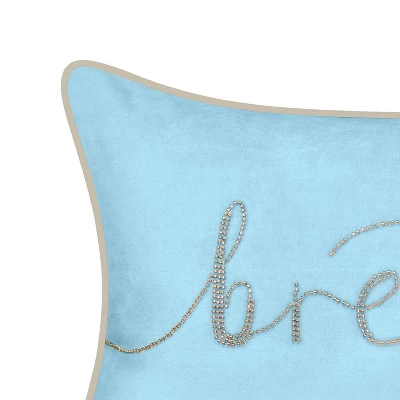 Edie@Home Collections combine timeless style with modern artisanal details to create fresh eye-catching dΓ©cor for your home. This chic Edie@Home lumbar pillow showcases a gentle reminder to take a deep breath, even when life is busy. “Breathe” pillow features delicate beaded script embroidery on a super soft velvet ground. Available in Mist/gray and Sand/Taupe. Measures 12 in. x 20 in. Convenient zipper closure. Easy spot clean. 100% Polyester.