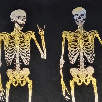 The Halloween Collection by Edie@Home is a stylish way to make your home feel festive during the holidays with chic prints and designs in cozy fabrics. The Rocker Skeletons Throw Pillow features a glam rock gold gradient foil print over rich velvet. Each pillow measures 18 in. x 18 in. 100% Polyester with a poly fill insert. Convenient zipper closure. Easy spot clean.