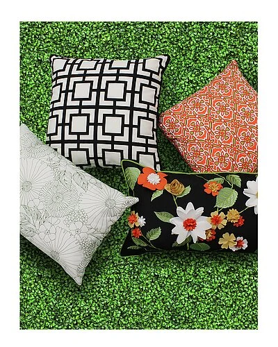 - Design details: the edie@home outdoor pillow collection combines fresh, stylish designs and high-quality fabrics made to withstand the elements of the outdoors. the modern links applique indoor & outdoor decorative pillow features a fresh take on a traditional geometric pattern. perfect for indoors or outdoors, durable and colorfast polyester applique and embroidery is made to last year after year. a variety of bright color options over a white ground add a pop of color and can be mixed and matched. each plush throw pillow measures 20″ x 20″. available in citron, black, aqua and leaf. convenient zipper closure. easy spot clean. 100% polyester. can be used indoors or outdoors.